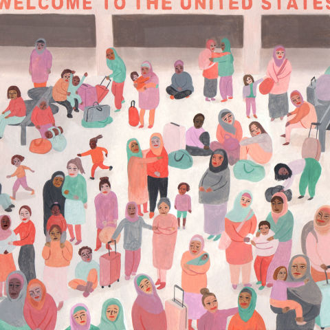 It's so weaponized. Trump rarely says the word "refugees" — he calls refugees "illegal immigrants." Just consider, who is used to language being twisted? I think that is such a feminized experience: who owns language, who gets to use language, and who decides the way language is used against people. I was struck by that. There were a couple times that I said to people, "We've claimed this territory. This piece of the airport belongs to us. The CBP agents don't go to the Starbucks anymore because they don't want to walk by us."